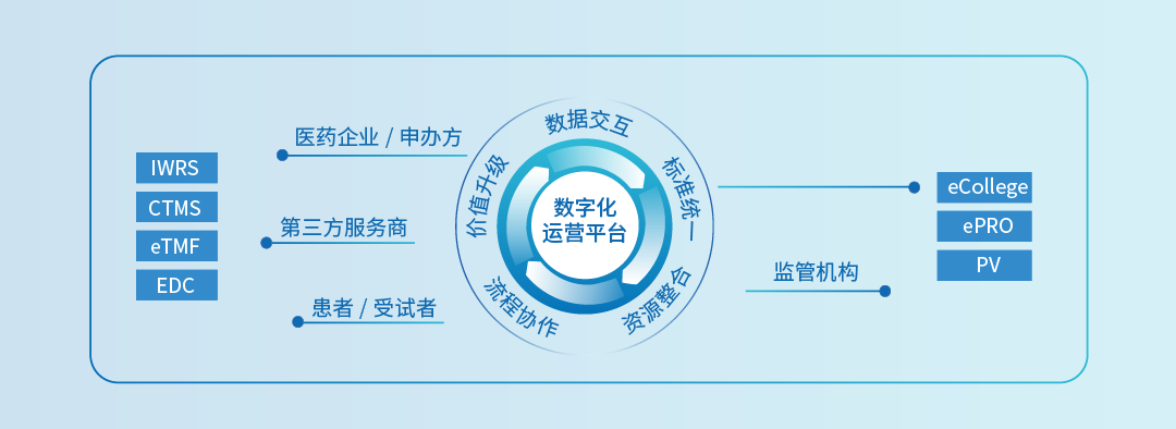數字化運營平臺,全方位數字驅動。 憑借專業數字化軟件、協作平臺和專業服務能力,鏈接醫院、制藥企業、服務商、監管機構、患者等行業參與者,實現各環節全方位數據驅動,致力于用創新的服務模式和多維的信息化技術推動臨床研究的發展。
