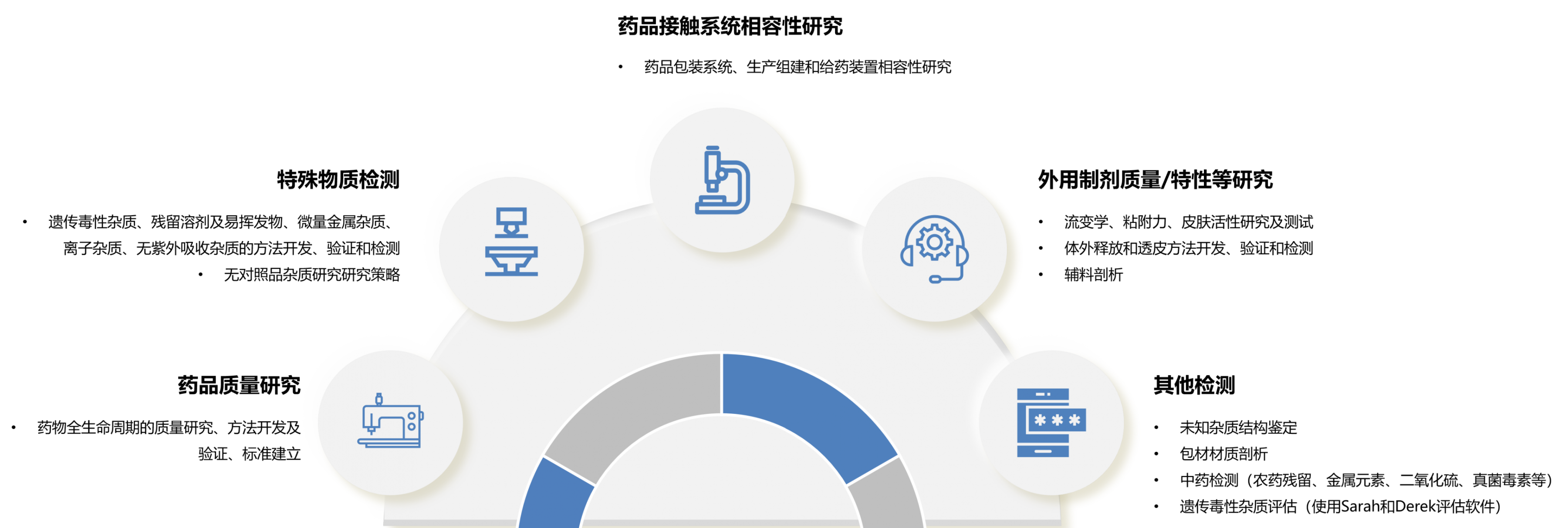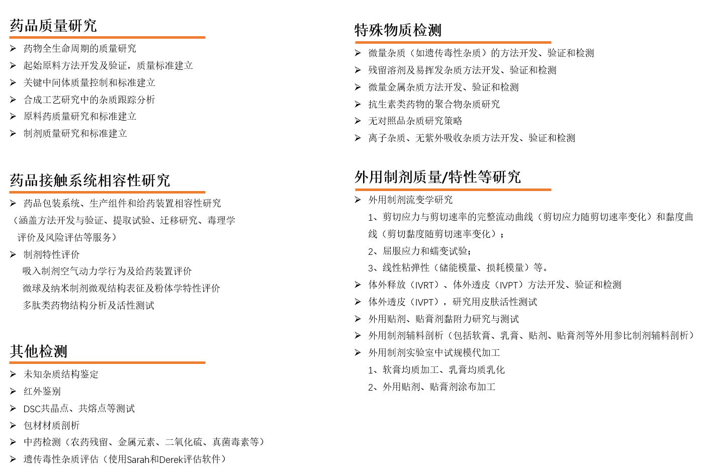 基于公司(集團)先進的檢測設備和完善的質量管理體系,能夠幫助項目組完成復雜化合物檢測方法的開發、相容性研究(包材、給藥裝置、生產組件等)及特殊雜質的檢測(元素雜質、遺傳毒雜質、金屬離子、聚合物等)。