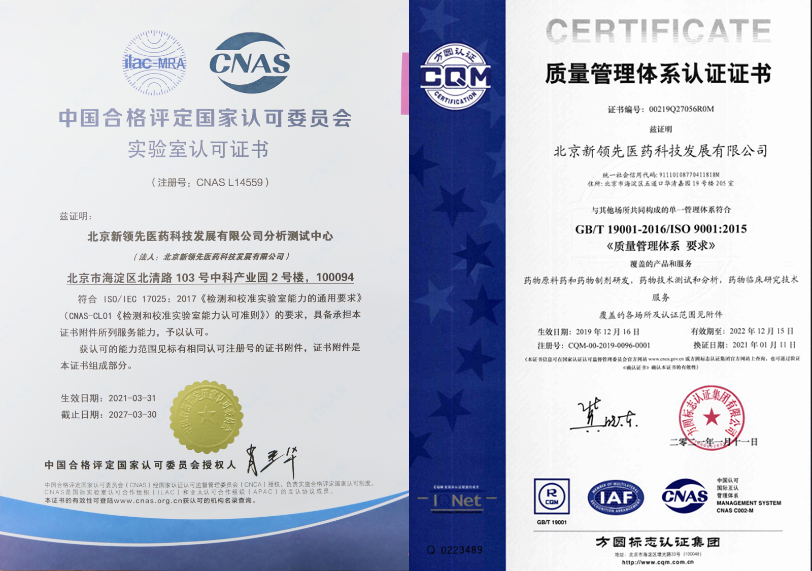 北京新領先醫藥科技發展有限公司分析測試中心面向國內外藥企提供檢測技術服務,積累了豐富的藥物質量研究經驗,主要提供痕量物質如遺傳毒性雜質、元素雜質、殘留溶劑、聚合物雜質、復雜制劑輔料剖析、藥品接觸系統相容性研究等符合NMPA、FDA、EMA等法規要求的研究檢測服務。本中心先后通過了ISO9001質量管理體系認證和中國合格評定國家認可委員會(CNAS)實驗室認可資質。
