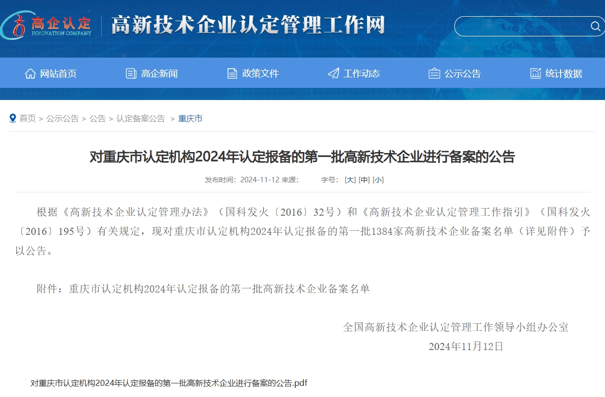 近日,國家高新企業技術認定管理工作網發布《對重慶市認定機構2024年認定報備的第一批高新技術企業進行備案的公告》,新領先(重慶)醫藥科技成功通過國家“高新技術企業”認定!