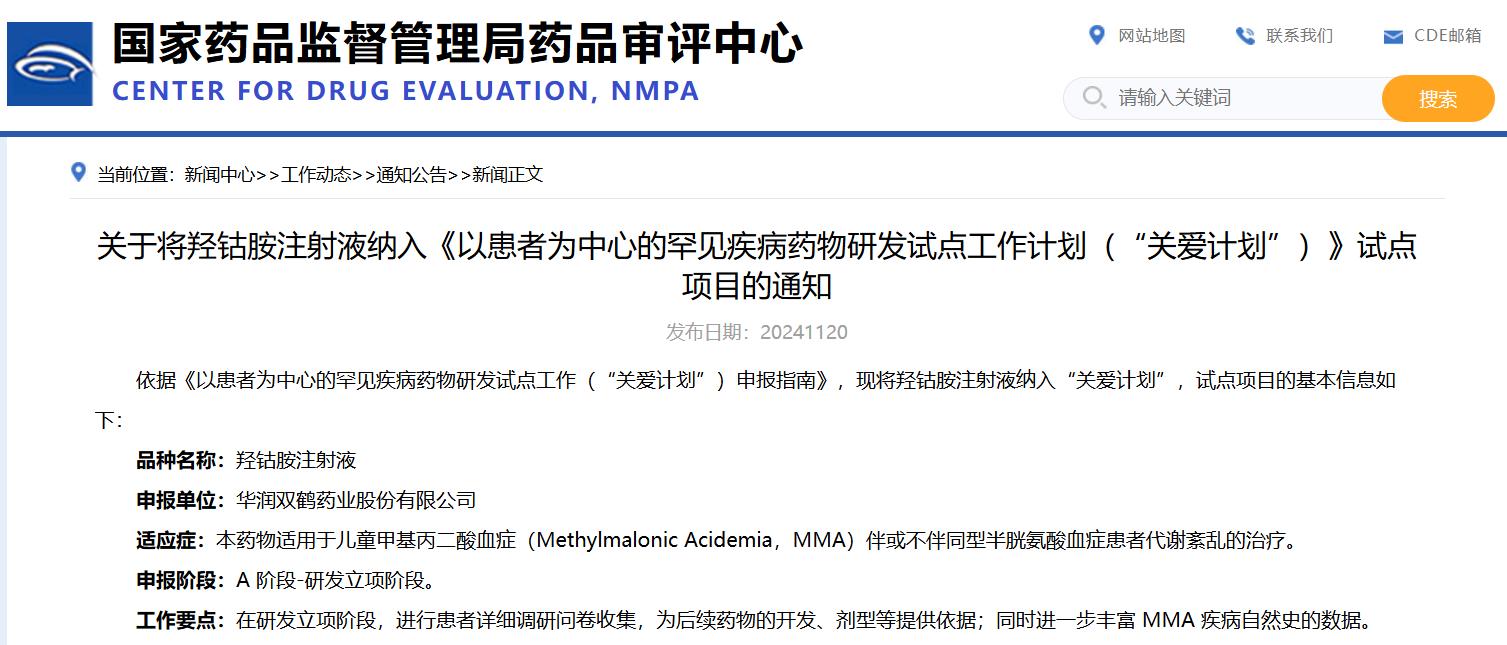 關于將羥鈷胺注射液納入《以患者為中心的罕見疾病藥物研發試點工作計劃(“關愛計劃”)》試點項目的通知