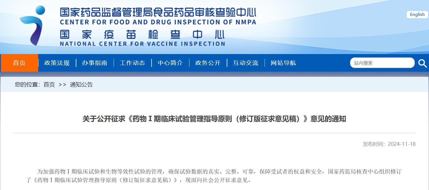 關于公開征求《藥物Ⅰ期臨床試驗管理指導原則(修訂版征求意見稿)》意見的通知