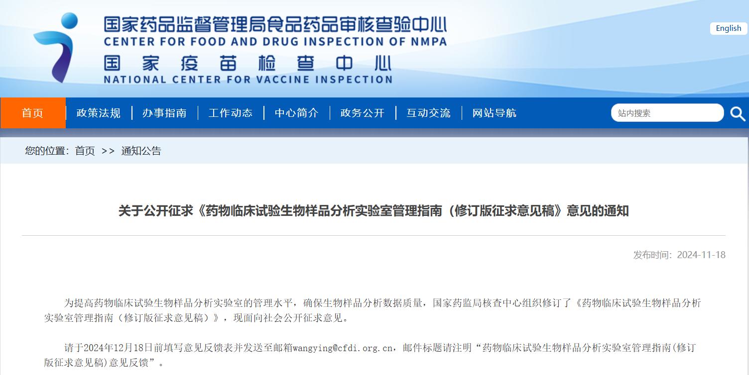關于公開征求《藥物臨床試驗生物樣品分析實驗室管理指南(修訂版征求意見稿)》意見的通知