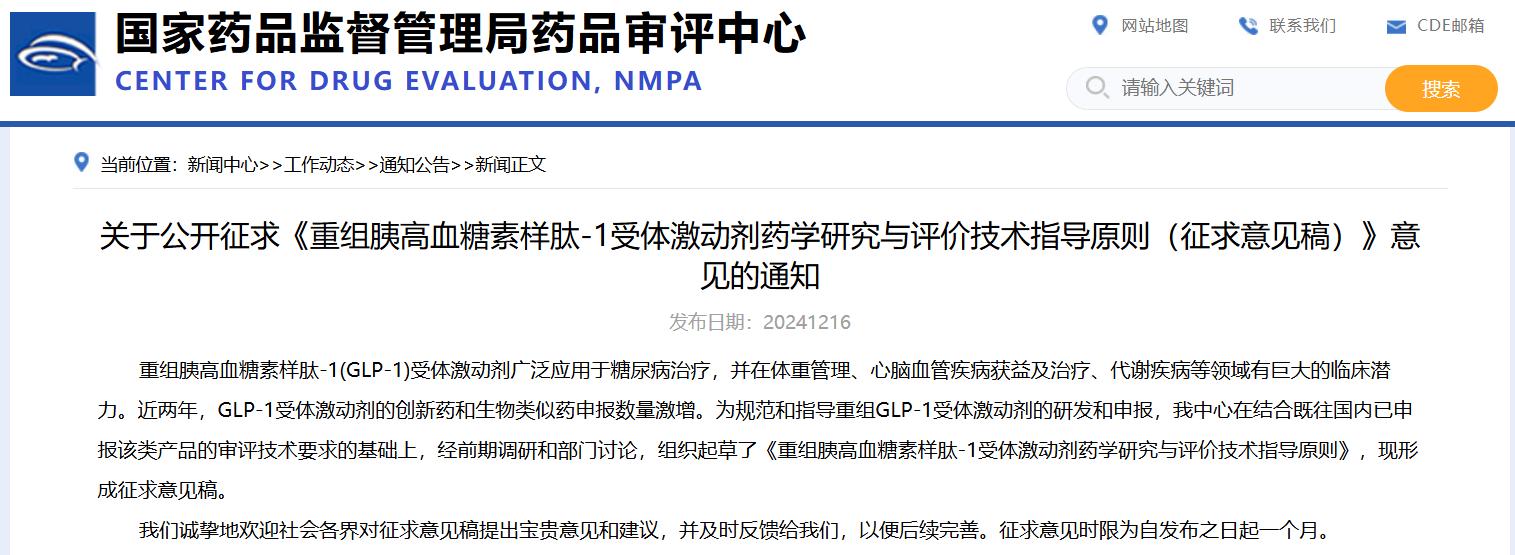 關于公開征求《重組胰高血糖素樣肽-1受體激動劑藥學研究與評價技術指導原則(征求意見稿)》意見的通知