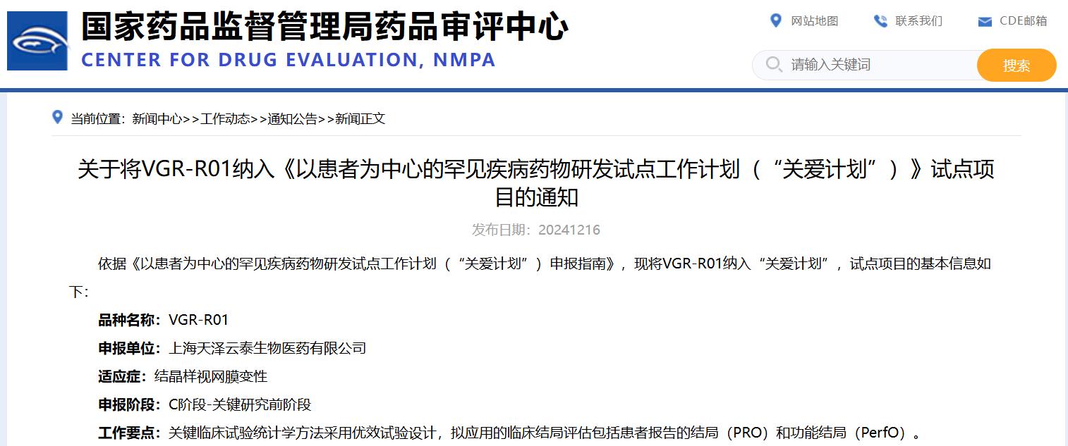 關于將VGR-R01納入《以患者為中心的罕見疾病藥物研發試點工作計劃(“關愛計劃”)》試點項目的通知