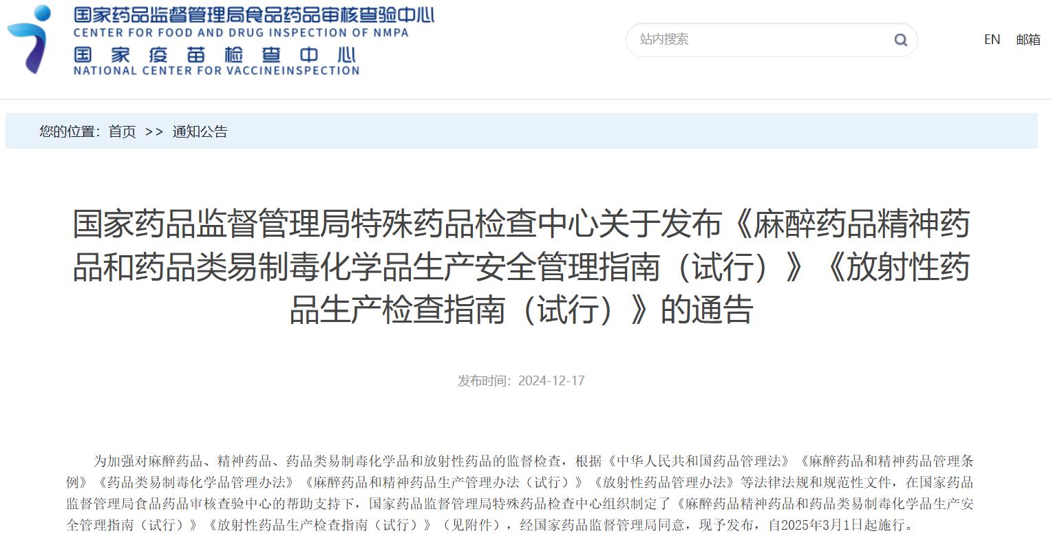 國家藥品監督管理局特殊藥品檢查中心關于發布《麻醉藥品精神藥品和藥品類易制毒化學品生產安全管理指南(試行)》《放射性藥品生產檢查指南(試行)》的通告