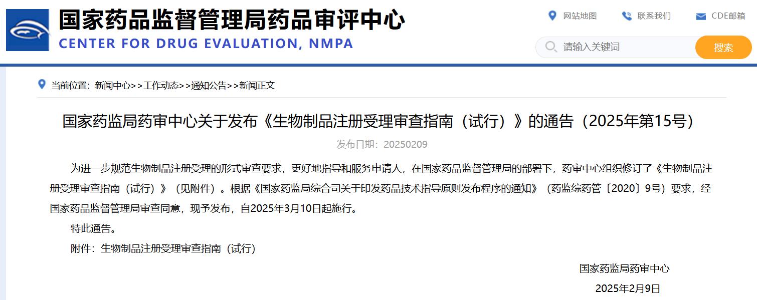 國家藥監局藥審中心關于發布《生物制品注冊受理審查指南(試行)》的通告(2025年第15號)