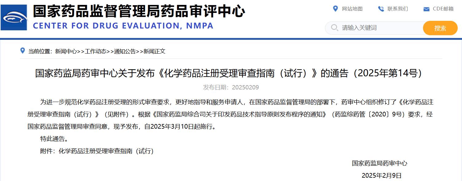 國家藥監局藥審中心關于發布《化學藥品注冊受理審查指南(試行)》的通告(2025年第14號)