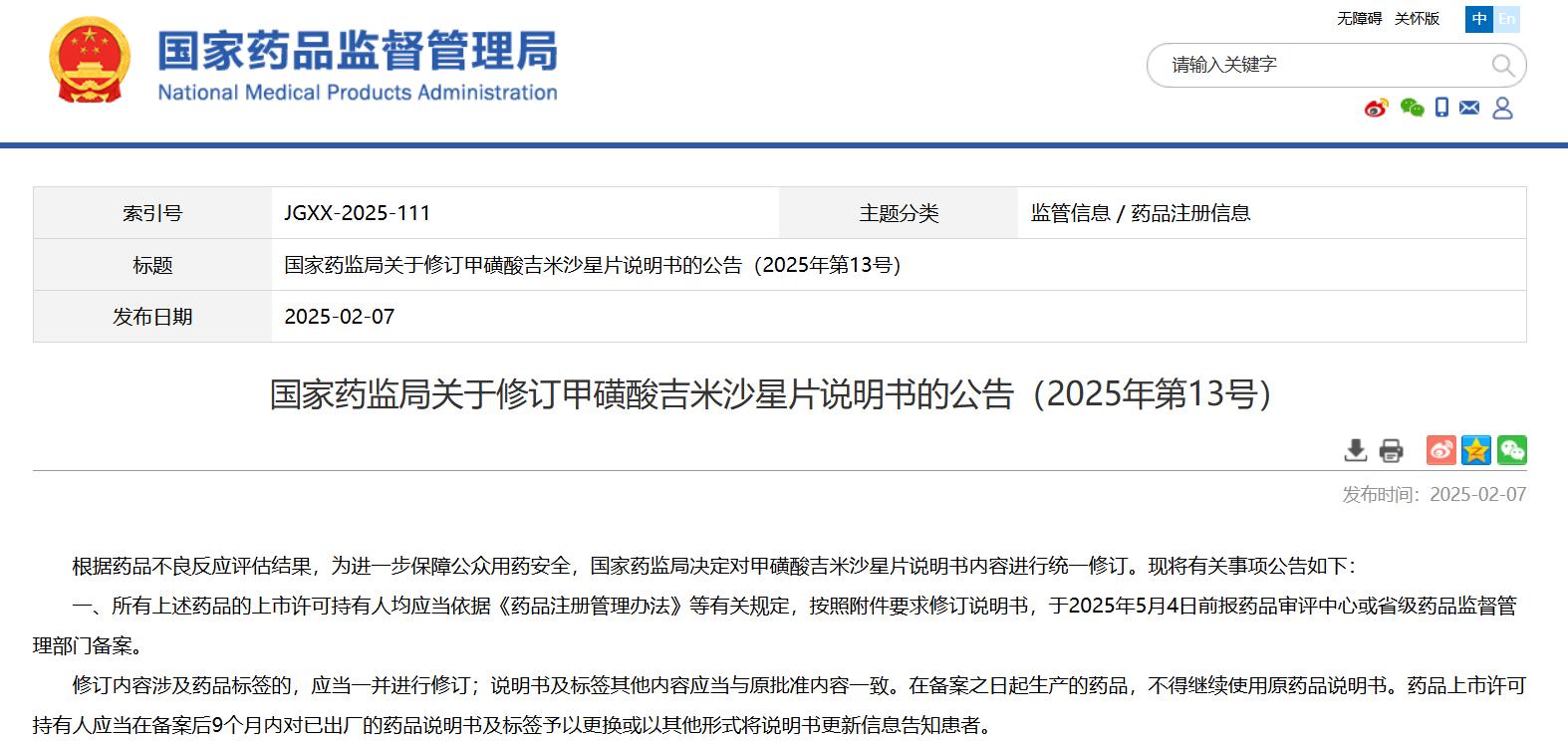 國家藥監局關于修訂甲磺酸吉米沙星片說明書的公告(2025年第13號)