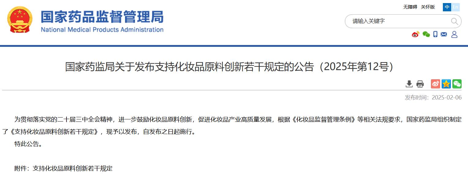 國家藥監局關于發布支持化妝品原料創新若干規定的公告(2025年第12號)