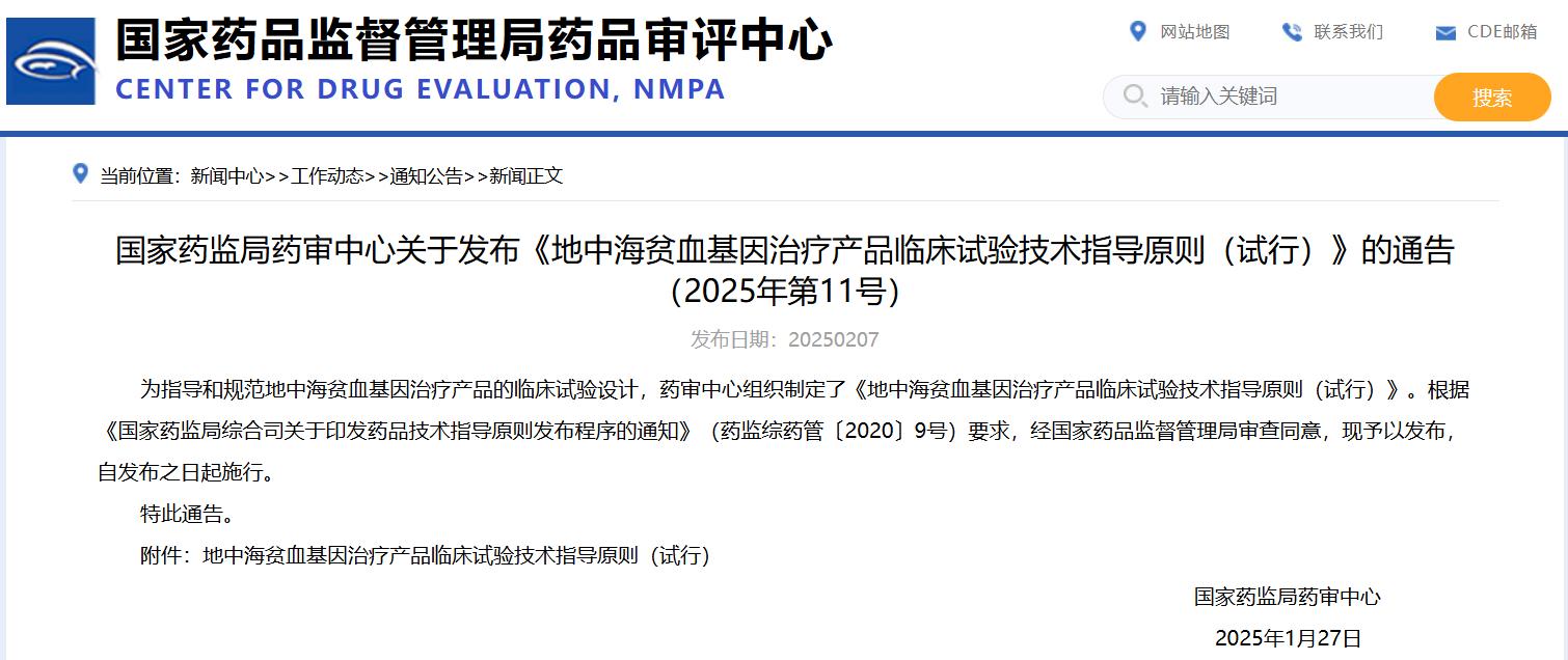 國家藥監局藥審中心關于發布《地中海貧血基因治療產品臨床試驗技術指導原則(試行)》的通告(2025年第11號)