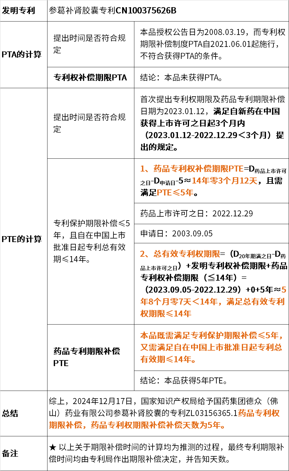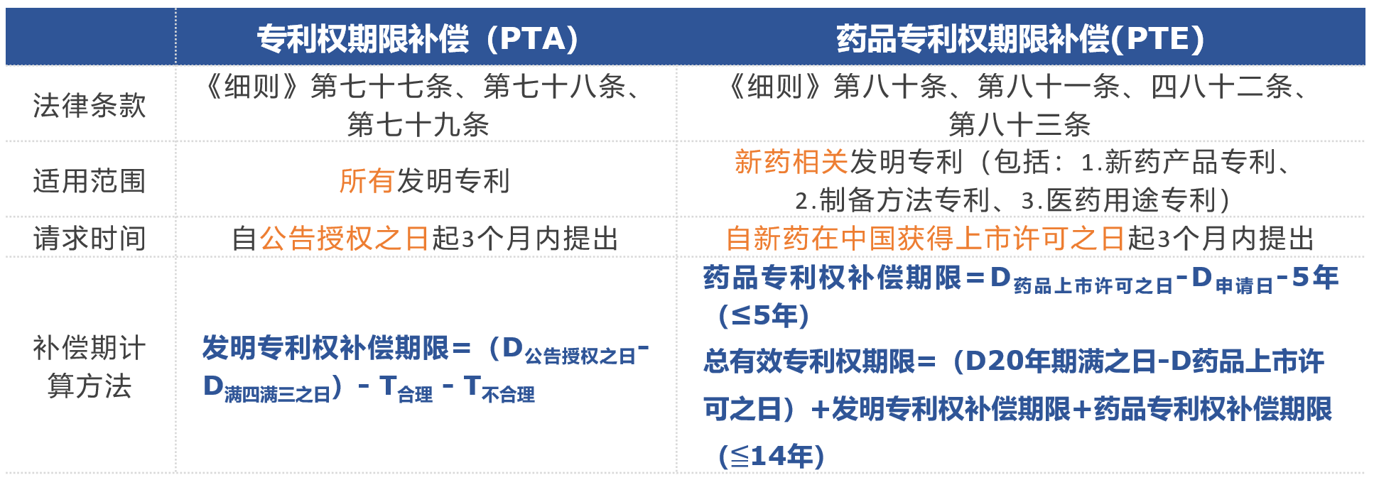 為了更直觀對(duì)比專(zhuān)利權(quán)期限補(bǔ)償(PTA)和藥品專(zhuān)利權(quán)期限補(bǔ)償(PTE)的區(qū)別,列出如下表格:
