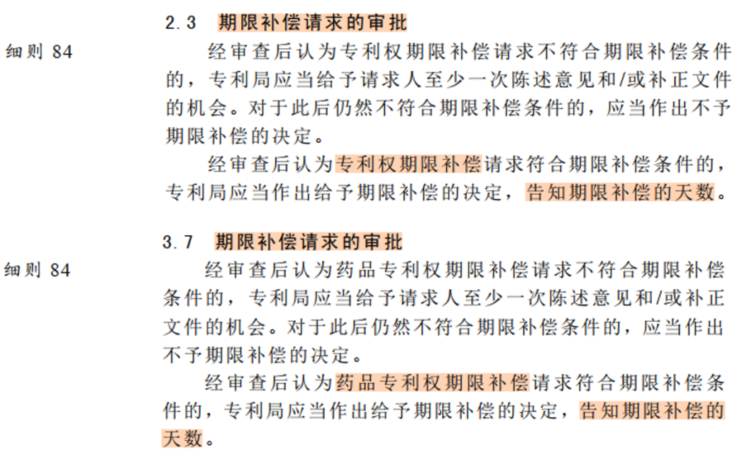 《審查指南》第五部分第九章2.3和3.7期限補(bǔ)償請(qǐng)求的審批作出如下規(guī)定,經(jīng)審查后認(rèn)為專(zhuān)利權(quán)期限補(bǔ)償請(qǐng)求符合期限補(bǔ)償條件的,均由專(zhuān)利局作出期限補(bǔ)償?shù)臎Q定,并告知期限補(bǔ)償?shù)奶鞌?shù)。