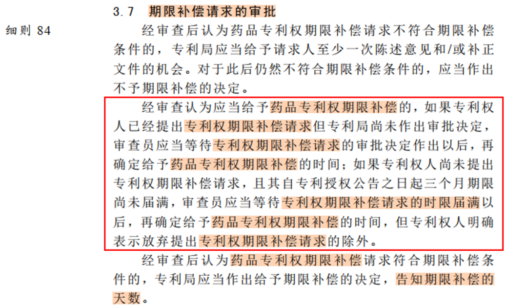 經(jīng)批準(zhǔn)認(rèn)為應(yīng)當(dāng)給予藥品專(zhuān)利權(quán)期限補(bǔ)償請(qǐng)求的,如果專(zhuān)利權(quán)人已經(jīng)提出專(zhuān)利權(quán)期限補(bǔ)償請(qǐng)求但專(zhuān)利局尚未審批決定,審查員應(yīng)當(dāng)?shù)却龑?zhuān)利權(quán)期限補(bǔ)償請(qǐng)求的審批決定作出以后,再確定給予藥品專(zhuān)利權(quán)期限補(bǔ)償?shù)臅r(shí)間;如果專(zhuān)利權(quán)人尚未提出專(zhuān)利權(quán)期限補(bǔ)償請(qǐng)求,且其自專(zhuān)利授權(quán)公告之日起三個(gè)月期限尚未屆滿,審查員應(yīng)當(dāng)?shù)却龑?zhuān)利權(quán)期限補(bǔ)償請(qǐng)求的時(shí)限屆滿以后,再確定給予藥品專(zhuān)利權(quán)期限補(bǔ)償請(qǐng)求的時(shí)間,但專(zhuān)利權(quán)人明確表示放棄提出專(zhuān)利權(quán)期限補(bǔ)償請(qǐng)求除外。