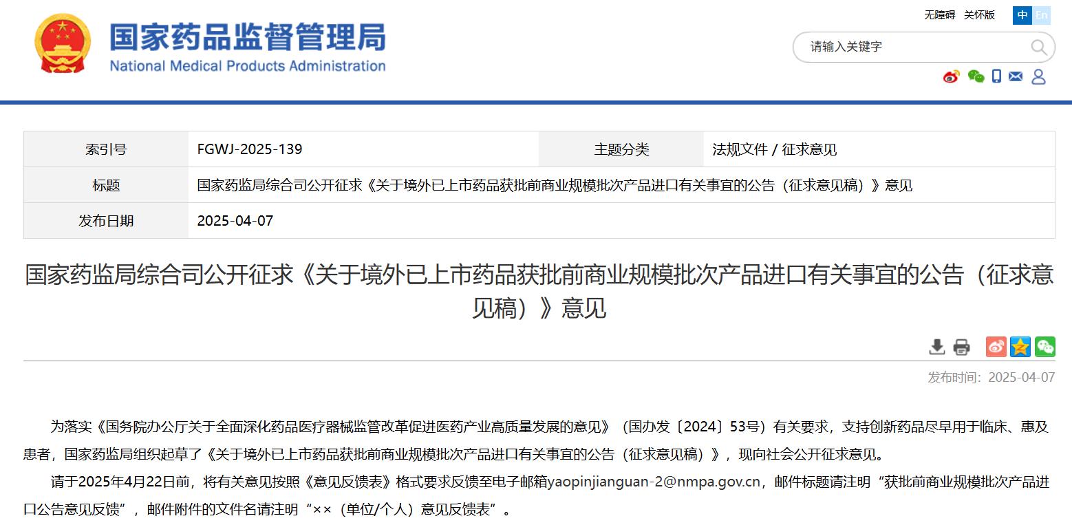 為落實《國務院辦公廳關于全面深化藥品醫療器械監管改革促進醫藥產業高質量發展的意見》(國辦發〔2024〕53號)有關要求,支持創新藥品盡早用于臨床、惠及患者,國家藥監局組織起草了《關于境外已上市藥品獲批前商業規模批次產品進口有關事宜的公告(征求意見稿)》,現向社會公開征求意見。