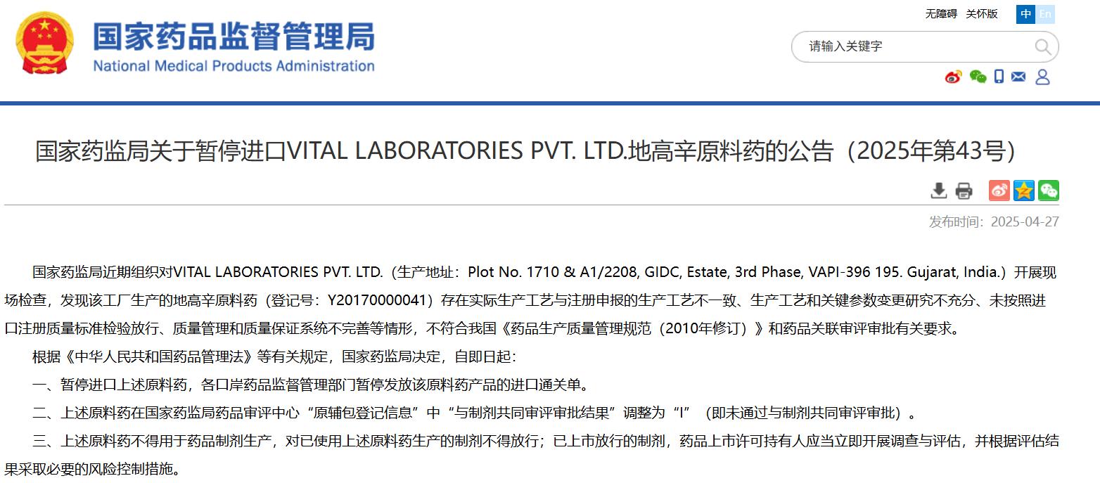 國家藥監局關于暫停進口VITAL LABORATORIES PVT. LTD.地高辛原料藥的公告(2025年第43號)