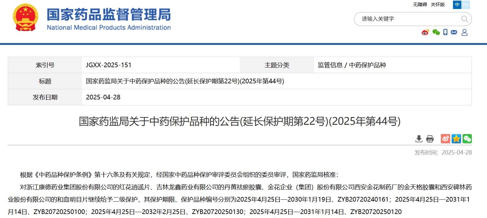 國家藥監局關于中藥保護品種的公告(延長保護期第22號)(2025年第44號)