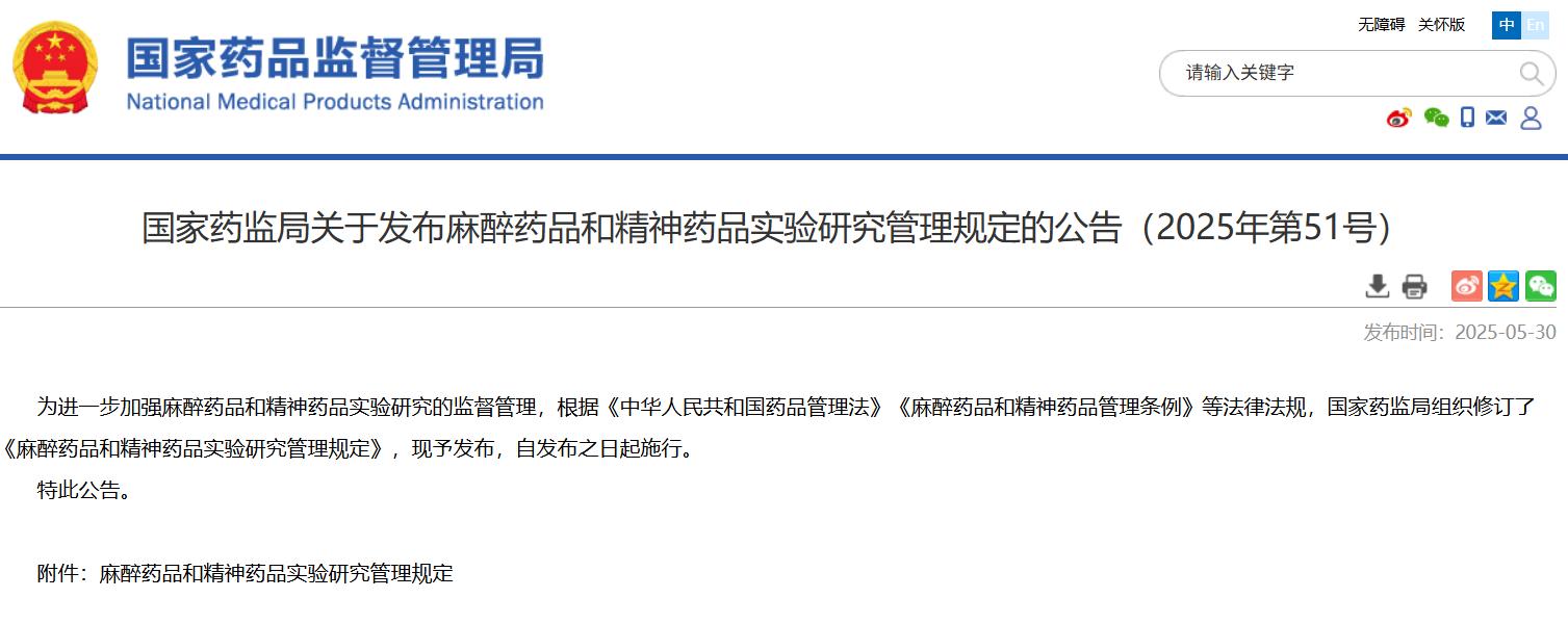 國家藥監局關于發布麻醉藥品和精神藥品實驗研究管理規定的公告(2025年第51號)