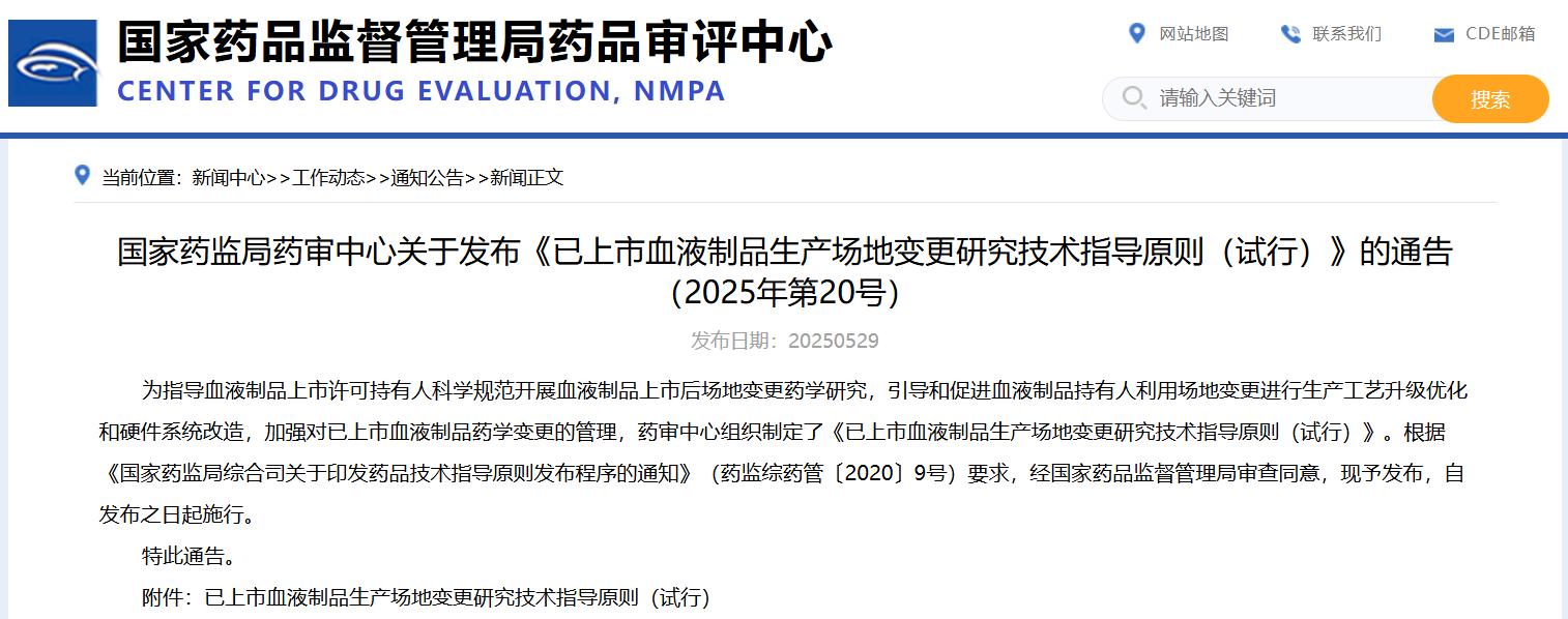 國家藥監局藥審中心關于發布《已上市血液制品生產場地變更研究技術指導原則(試行)》的通告(2025年第20號)