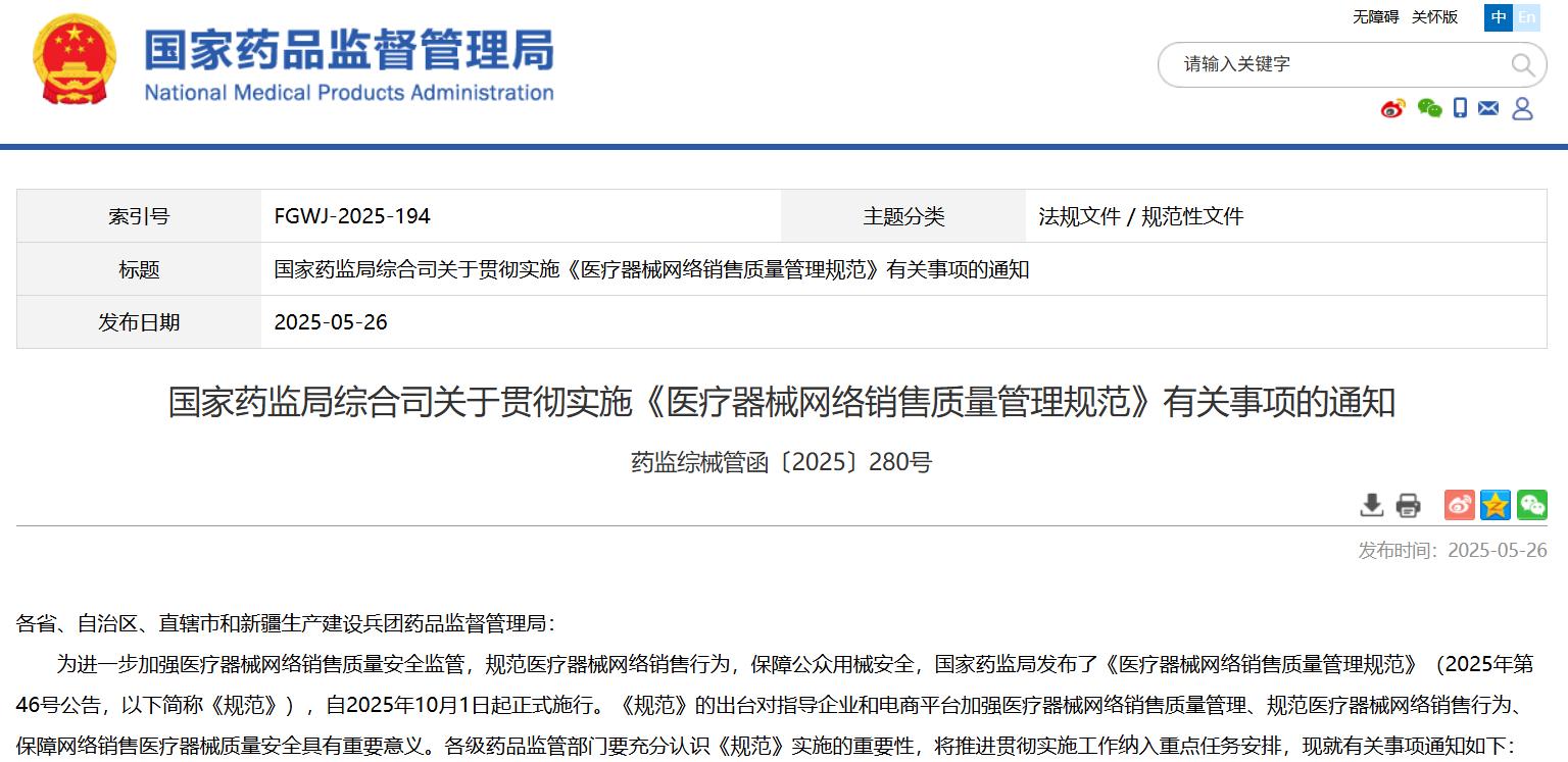 為進(jìn)一步加強(qiáng)醫(yī)療器械網(wǎng)絡(luò)銷售質(zhì)量安全監(jiān)管,規(guī)范醫(yī)療器械網(wǎng)絡(luò)銷售行為,保障公眾用械安全,國家藥監(jiān)局發(fā)布了《醫(yī)療器械網(wǎng)絡(luò)銷售質(zhì)量管理規(guī)范》,自2025年10月1日起正式施行。