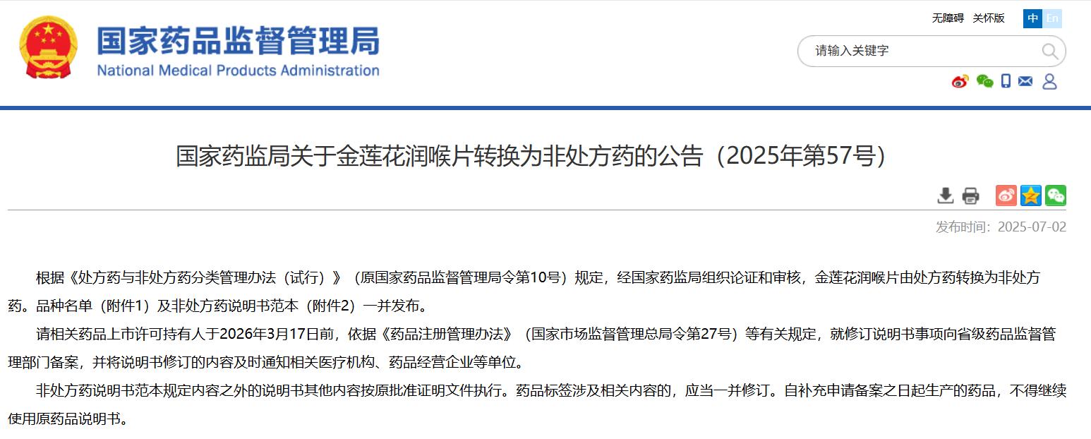 國家藥監(jiān)局關于金蓮花潤喉片轉換為非處方藥的公告(2025年第57號)