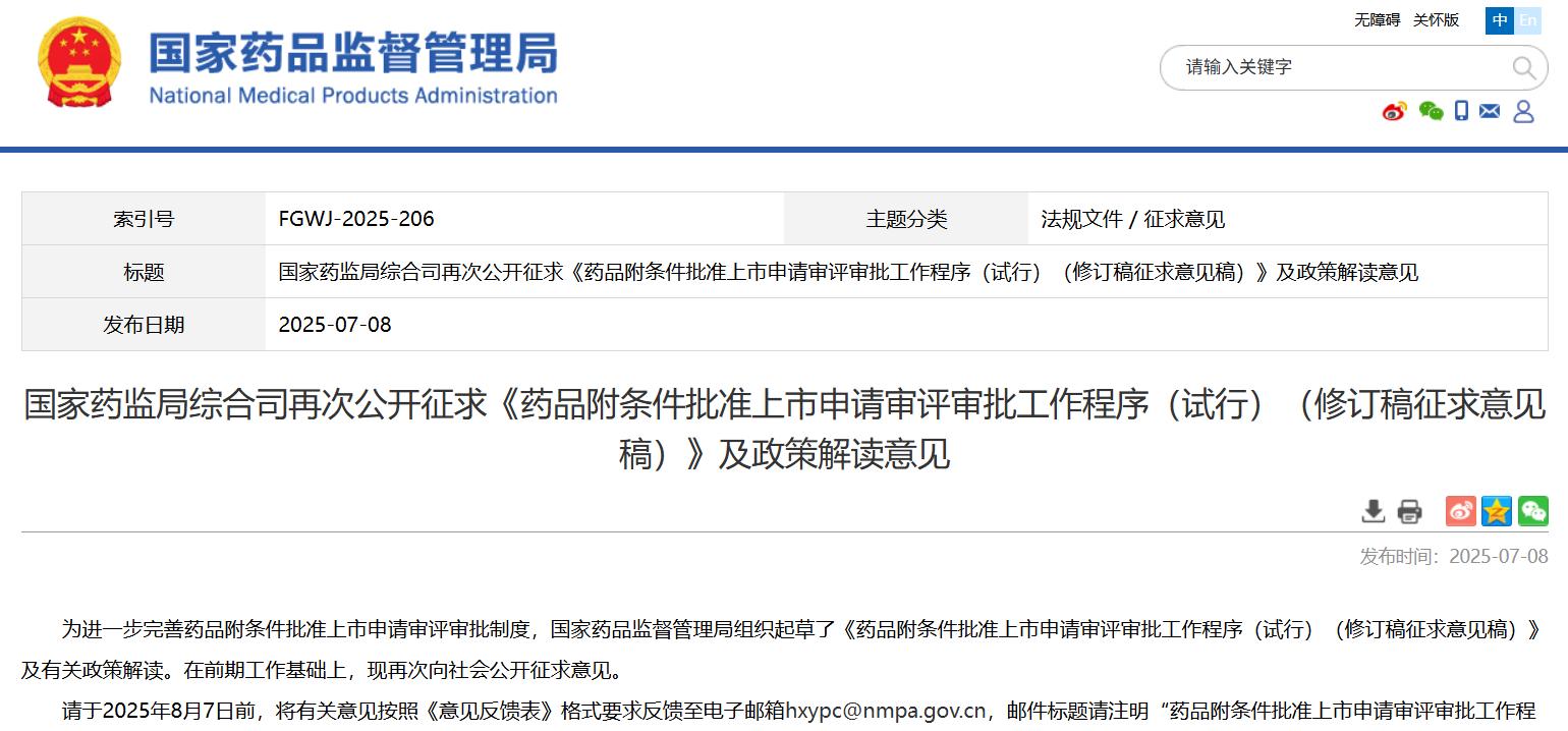 國家藥監局綜合司再次公開征求《藥品附條件批準上市申請審評審批工作程序(試行)(修訂稿征求意見稿)》及政策解讀意見