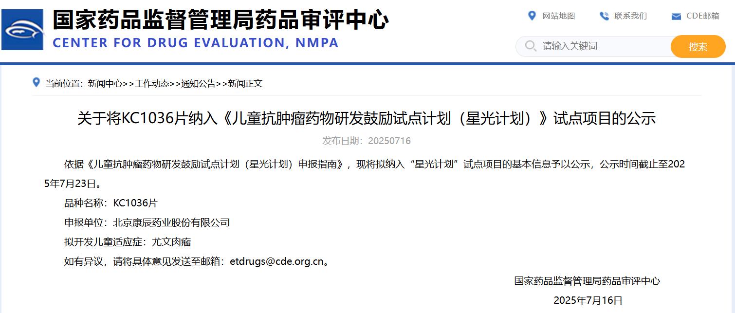 關(guān)于將KC1036片納入《兒童抗腫瘤藥物研發(fā)鼓勵試點計劃(星光計劃)》試點項目的公示