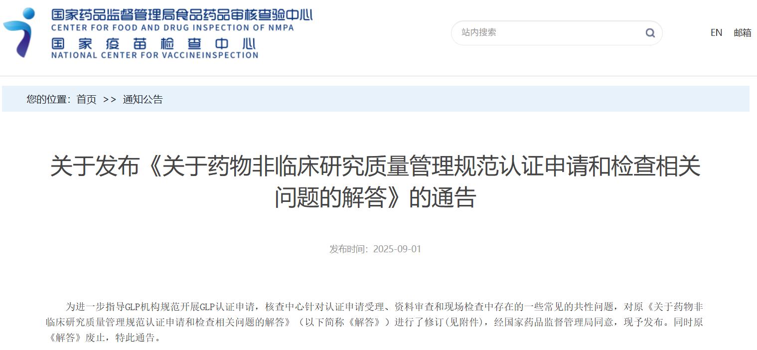 關于發布《關于藥物非臨床研究質量管理規范認證申請和檢查相關問題的解答》的通告