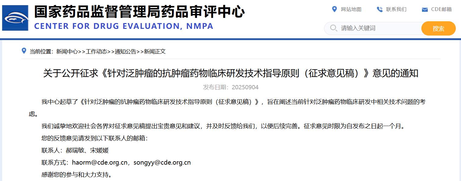 關于公開征求《針對泛腫瘤的抗腫瘤藥物臨床研發技術指導原則(征求意見稿)》意見的通知