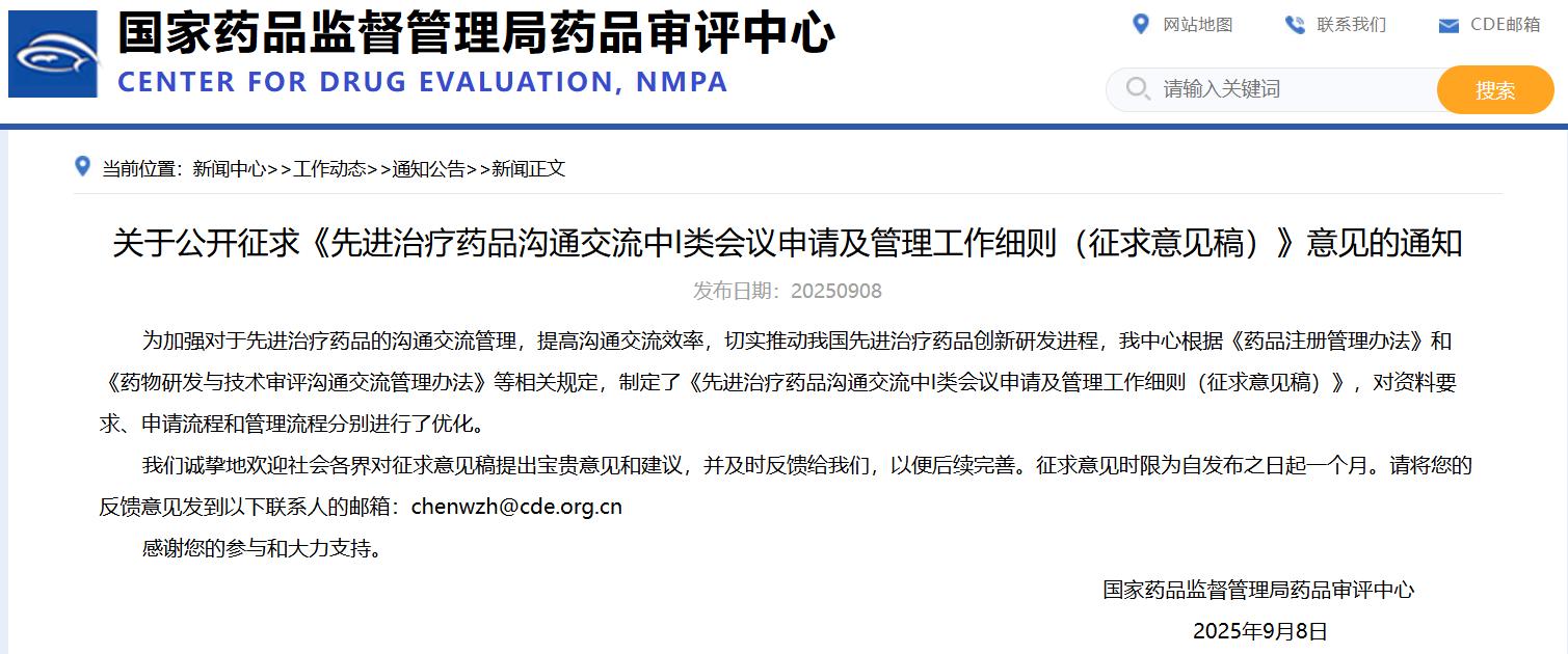 關(guān)于公開(kāi)征求《先進(jìn)治療藥品溝通交流中I類(lèi)會(huì)議申請(qǐng)及管理工作細(xì)則(征求意見(jiàn)稿)》意見(jiàn)的通知