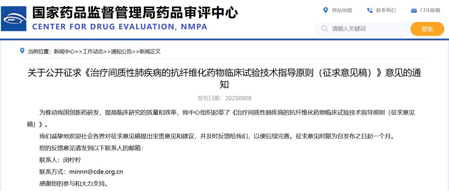 關(guān)于公開(kāi)征求《治療間質(zhì)性肺疾病的抗纖維化藥物臨床試驗(yàn)技術(shù)指導(dǎo)原則(征求意見(jiàn)稿)》意見(jiàn)的通知