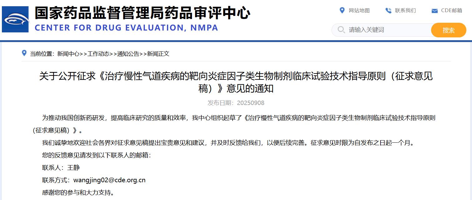 關(guān)于公開(kāi)征求《治療慢性氣道疾病的靶向炎癥因子類(lèi)生物制劑臨床試驗(yàn)技術(shù)指導(dǎo)原則(征求意見(jiàn)稿)》