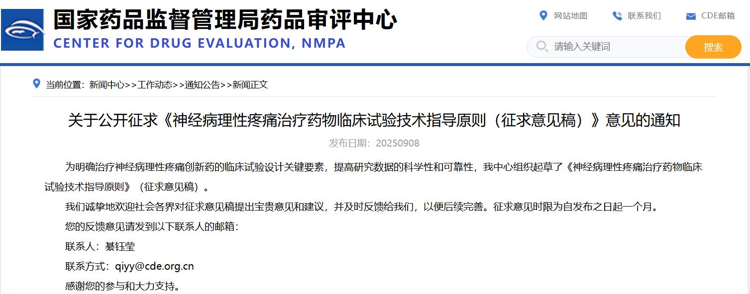 關(guān)于公開(kāi)征求《神經(jīng)病理性疼痛治療藥物臨床試驗(yàn)技術(shù)指導(dǎo)原則(征求意見(jiàn)稿)》意見(jiàn)的通知