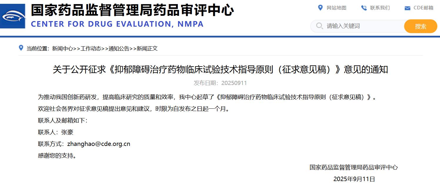 關(guān)于公開(kāi)征求《抑郁障礙治療藥物臨床試驗(yàn)技術(shù)指導(dǎo)原則(征求意見(jiàn)稿)》意見(jiàn)的通知