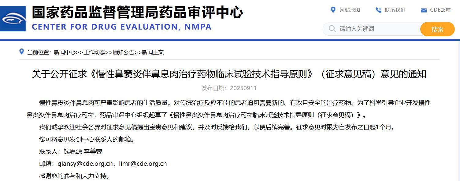 關(guān)于公開(kāi)征求《慢性鼻竇炎伴鼻息肉治療藥物臨床試驗(yàn)技術(shù)指導(dǎo)原則》(征求意見(jiàn)稿)意見(jiàn)的通知
