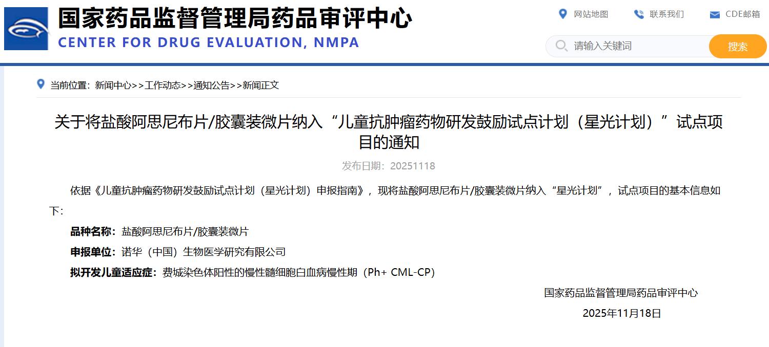 關于將鹽酸阿思尼布片/膠囊裝微片納入“兒童抗腫瘤藥物研發鼓勵試點計劃(星光計劃)”試點項目的通知