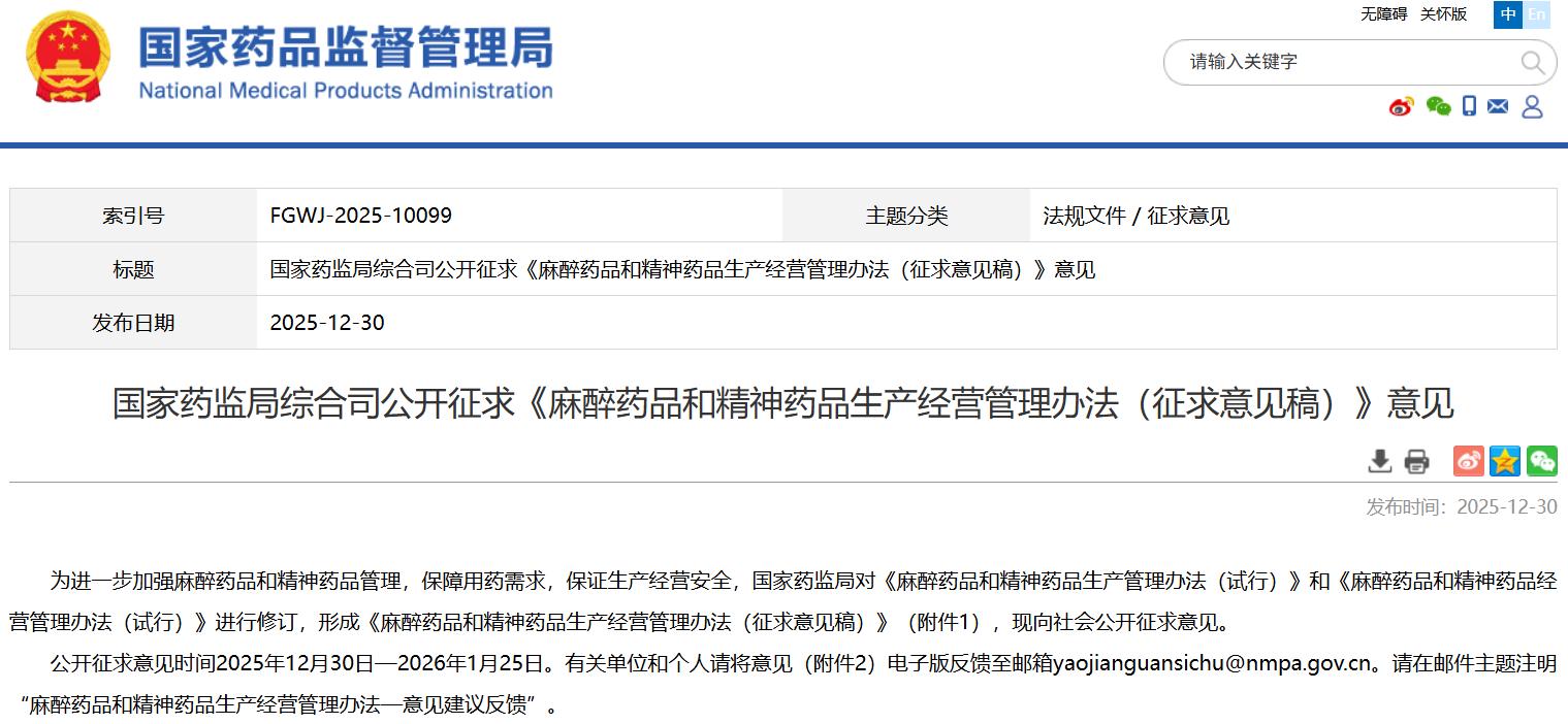 國家藥監局綜合司關于公開征求《麻醉藥品和精神藥品生產經營管理辦法(征求意見稿)》意見