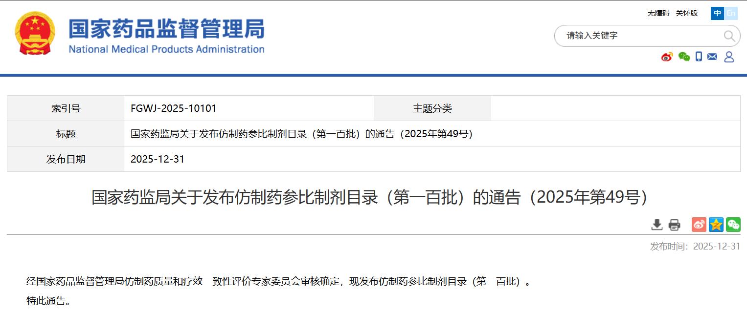 國家藥監局關于發布仿制藥參比制劑目錄(第一百批)的通告(2025年第49號)