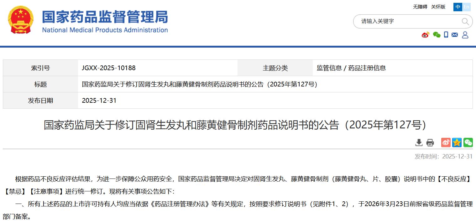 國家藥監局關于修訂固腎生發丸和藤黃健骨制劑藥品說明書的公告(2025年第127號)