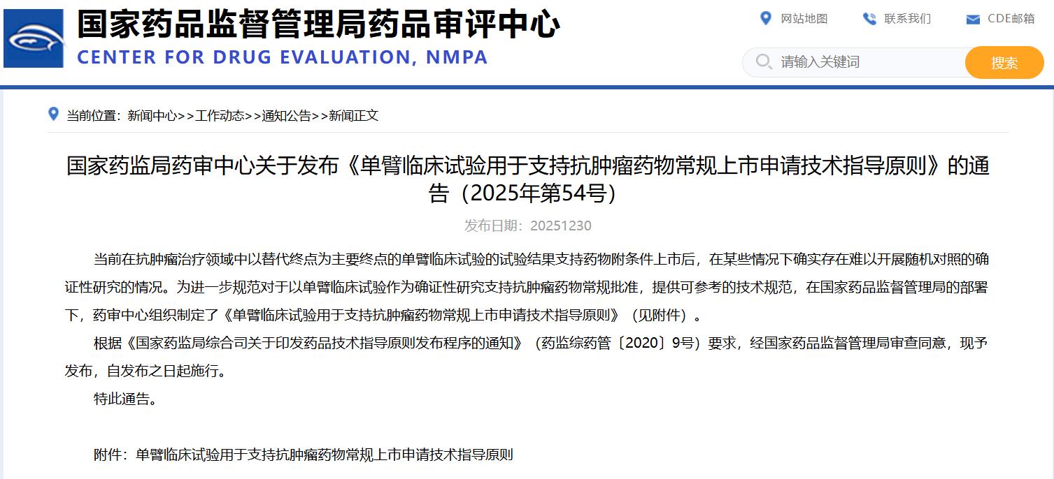 國家藥監局藥審中心關于發布《單臂臨床試驗用于支持抗腫瘤藥物常規上市申請技術指導原則》的通告(2025年第54號)