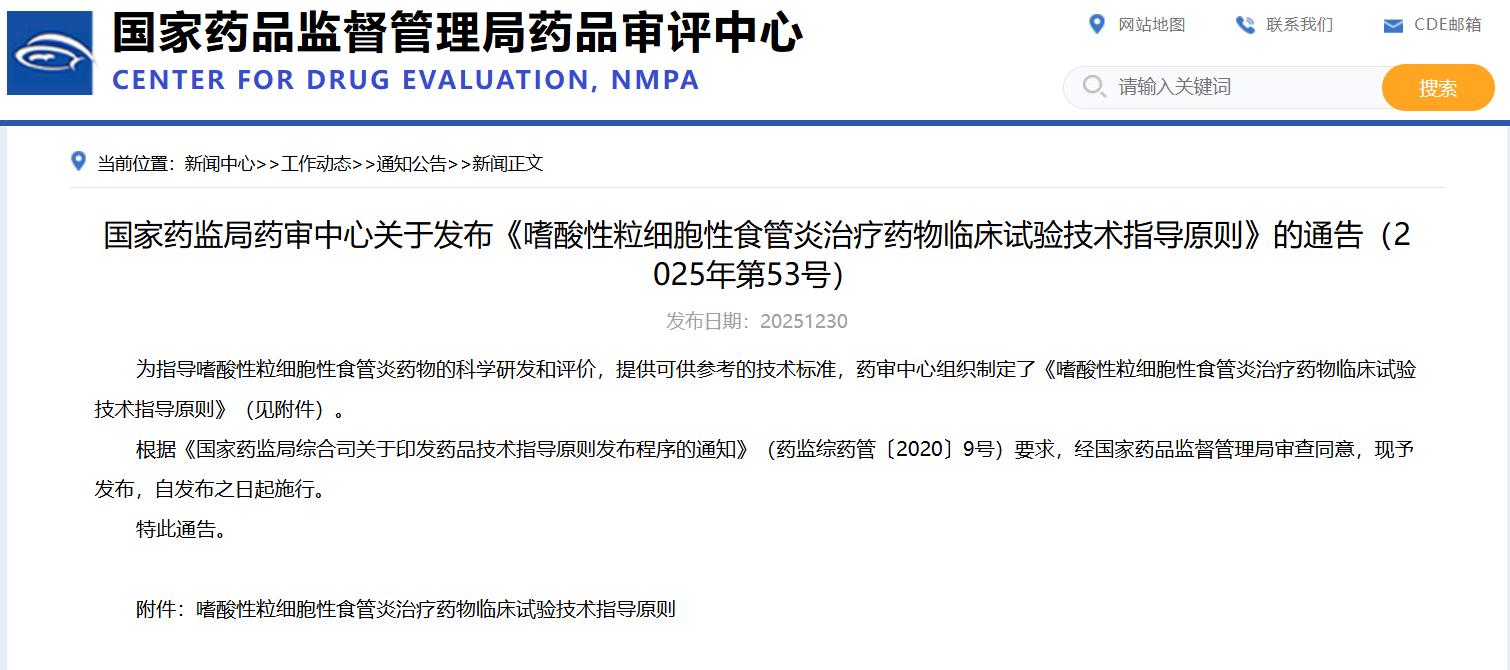 國家藥監局藥審中心關于發布《嗜酸性粒細胞性食管炎治療藥物臨床試驗技術指導原則》的通告(2025年第53號)
