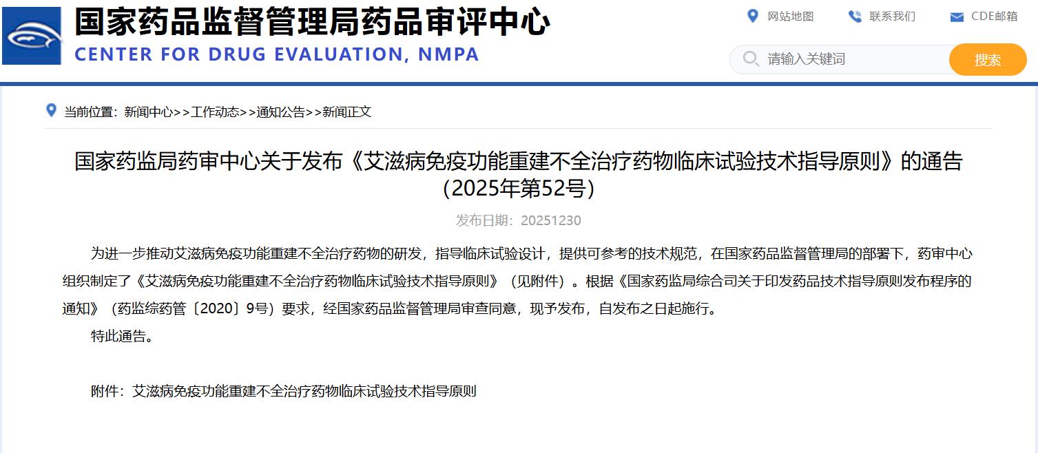 國家藥監局藥審中心關于發布《艾滋病免疫功能重建不全治療藥物臨床試驗技術指導原則》的通告(2025年第52號)