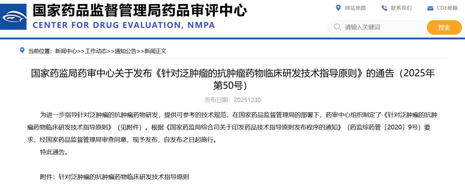 國家藥監局藥審中心關于發布《針對泛腫瘤的抗腫瘤藥物臨床研發技術指導原則》的通告(2025年第50號)