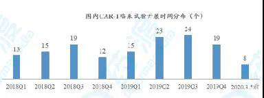 我們對Clinicaltrials.gov數據庫導出的148個CAR-T臨床試驗進行了整理分析,2018年至今正式開展的臨床試驗個數時間分布見下圖。