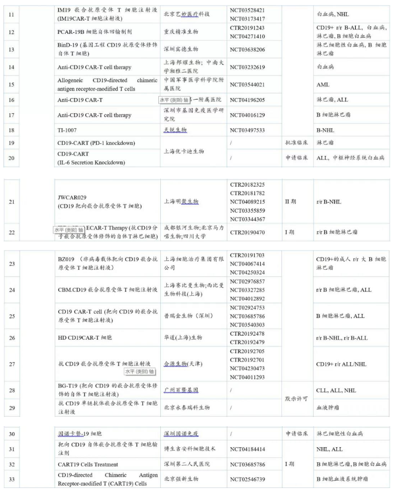 國內針對CD19的CAR-T品種多達50余個,其中進展最快的是國外已上市的Yescarta®,國內暫定名為益基利侖賽注射液,目前已在國內申請上市。此外,有5個中國1類品種處于臨床II期。