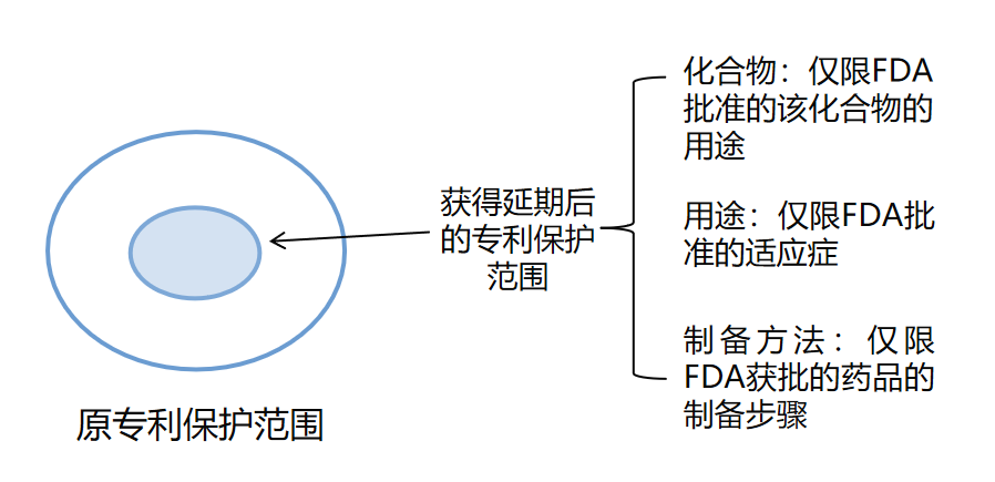 - (1)FDA批準的藥品專利有效期延長后的保護范圍小于原專利要求保護的范圍,如下圖所示: