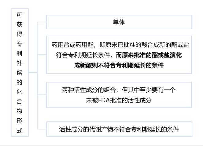 - (2)FDA對于可獲得專利期延長的藥品專利中的活性成分有特殊限定,如下所示: