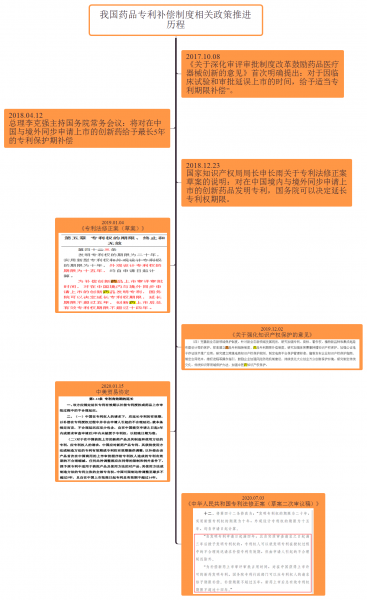 2017年10月《關于深化審評審批制度改革鼓勵藥品醫藥器械創新的意見》中首次明確提出對于因臨床試驗和審批延誤上市時間的藥品專利給予適當的專利期限補償。2019年1月公開的《專利法修正案(草案)》中提出對于在中國境內和境外同步申請上市的創新藥品發明專利,國務院可以給予專利期限延長。2020年7月公開的《專利法修正案(草案二次審議稿)》中則修改為對在中國獲批上市許可的新藥發明專利適當給予專利期限補償。