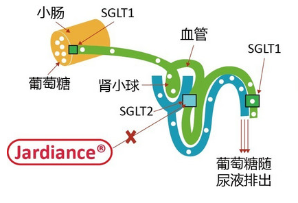 “列凈類”降糖藥即為SGLT-2抑制劑類降糖藥。SGLT-2是一種鈉葡萄糖轉運蛋白-2,它幾乎只分布于近端腎小管,主要的作用是使腎小管中的葡萄糖重吸收入血,而SGLT-2抑制劑的作用就在于降低腎小管重吸收葡萄糖的能力,使得經腎小球濾過之后進入尿液的葡萄糖排出體外,從而降低血液中葡萄糖的濃度,達到降低血糖的目的。