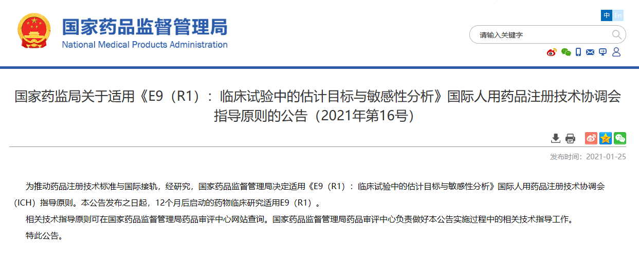 關(guān)于適用《E9(R1):臨床試驗(yàn)中的估計(jì)目標(biāo)與敏感性分析》國(guó)際人用藥品注冊(cè)技術(shù)協(xié)調(diào)會(huì)指導(dǎo)原則的公告(2021年第16號(hào))